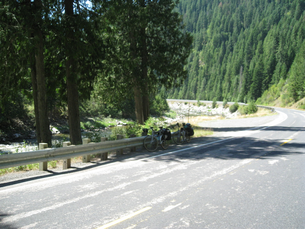 After a further 9 miles of toil nowhere had presented itself, save for a half built log cabin with signs saying “Danger. Do not Enter. Do not Tresspass [sic.]” The sight of a large number of pick-up trucks and the questionable spelling of the warning suggested to us that this would not be a sensible place to rest.
